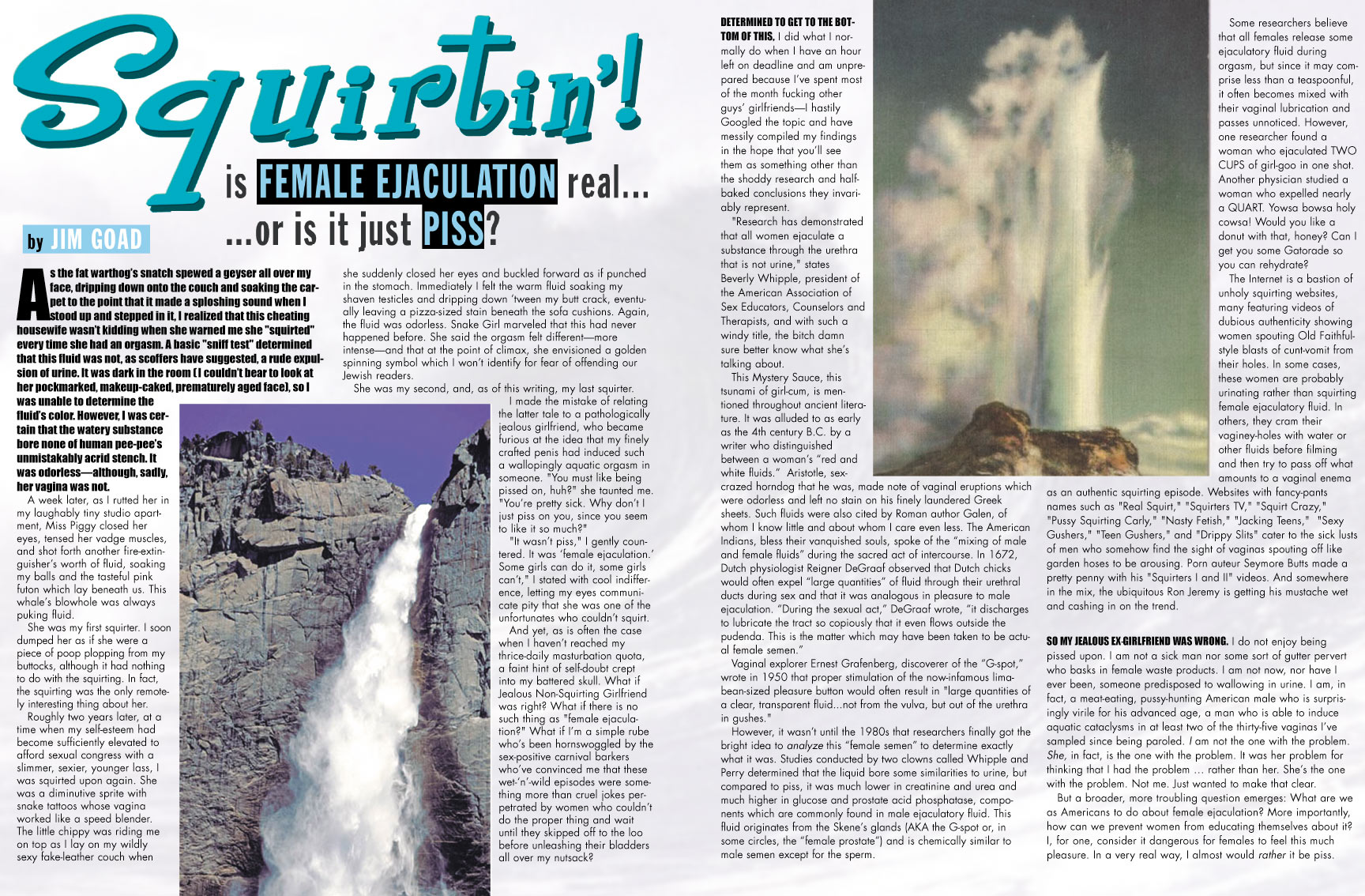 A few years ago, a run-of-the-mill chop-socky flick called Crouching Tiger, Hidden Dragon was nominated for a Best Picture Oscar for no discernible reason beyond the fact that its Kung Fu cowboys were able to climb walls and fly through the air. A few days ago, unaware that I NEVER go to see movies, someone recommended that I plop down $8 to go sit in dried cumstains and stray popcorn kernels to catch Kung Fu Hustle. Do they fly in it? "What do you mean?" You know, when they're doin' the Kung Fu—do they suddenly start flying around in the air? "Yeah, they fly around a bit." Yeah. Not interested. It bothers me when they fly around. How many innocent children have retardedly leapt to their deaths in imitation? Why are movie fans so stupid and conditioned that they don't even QUESTION all this flying-around anymore? Isn't that a sign of the End Times, or one of the Seven Seals of the Apocalypse—everyone will start flying around? He said nothing. And then I left. I walked. I didn't fly. People can't fly. ••••••••••••• Here's something I recently wrote about female ejaculation.