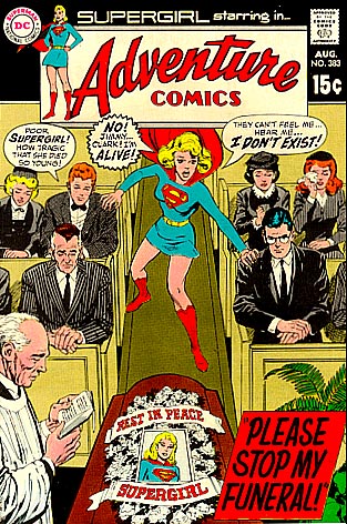 The picture to the right (a larger, more legible version is nestled here) is from a 1969 Supergirl comic called "PLEASE STOP MY FUNERAL!" I first encountered it in a box of my brother's books back while he was being slowly driven mad in Vietnam. And, apart from the blonde hair, friendly boobs, and snappin' 'gina, I identified with Supergirl's plight. She's at her own funeral—she can even see her own casket—yet she's screaming that she's alive. And no one, not even her loved ones, can see or hear her. They're certain she's dead.